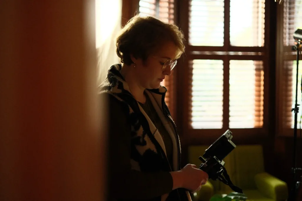 A home-based location styled to reflect a mid-century modern aesthetic, creating a warm, creative environment for lifestyle sequences.